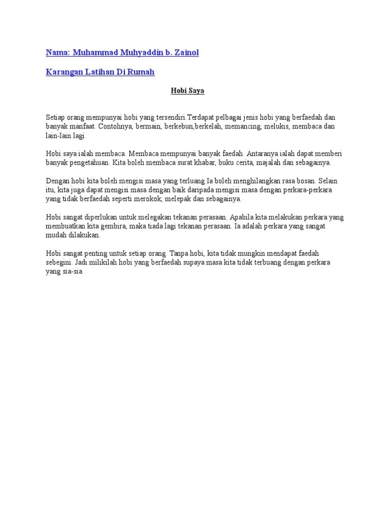 Petikan hobi saya hobi saya karangan qn855grvj8n1 from idoc.pub bahasa melayu tahun 5 (karangan hobi saya). Setiap orang pasti mempunyai hobi yang tersendiri. Hobi saya ialah bermain badminton. Saya juga mempunyai hobi iaitu bermain bola sepak. Sebelum melukis, saya gambarkan dahulu rupa pantai yang hendak dilukis berdasarkan pengamatan saya ketika pergi melancong. Melukis adalah hobi saya, karna melukis dapat meningkatkan.